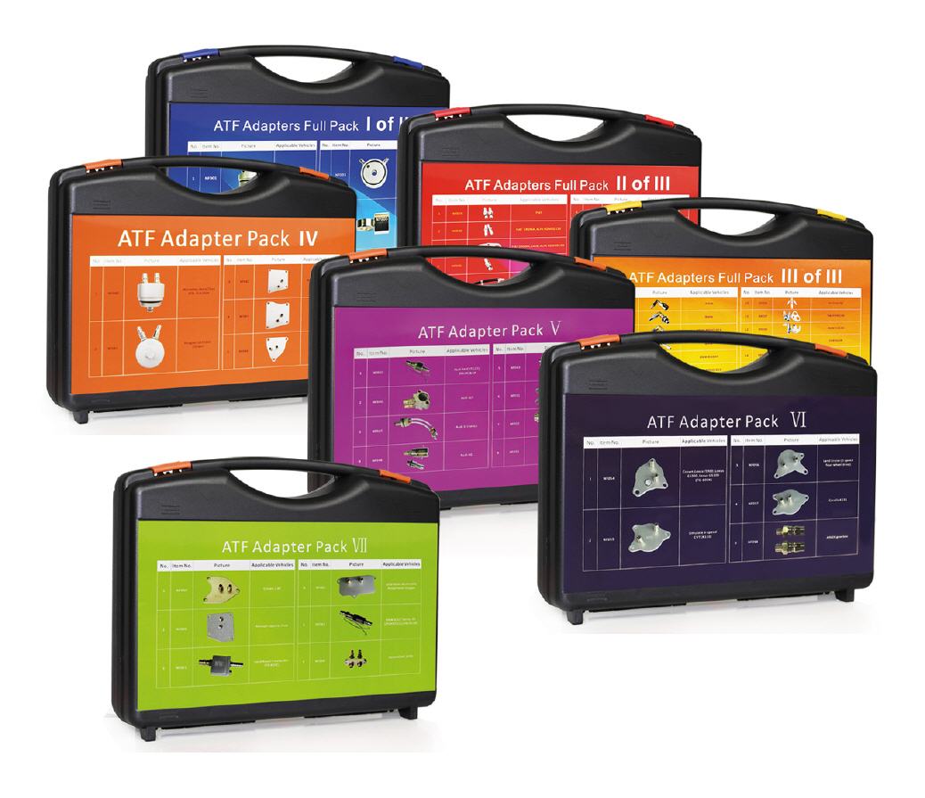 Zusätzlich zu dem im Lieferumfang enthaltenen Standard Adapterkoffer, gibt es weitere optional erhältliche ATF Adapter. Unsere ATF Adapter Pakete I – VII enthalten unterschiedliche Ventile, Steckverbindungen, Adapterschläuche sowie spezielle Bauteile, um den Anschluss an die unterschiedlichen Getriebearten und Modelle fachgemäß zu ermöglichen.
