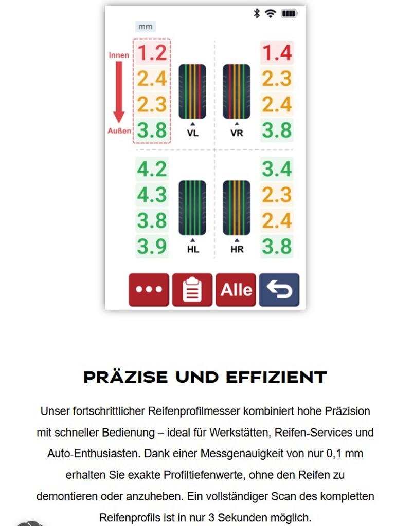 Unser Reifenprofiltiefenmesser garantiert eine außergewöhnliche Genauigkeit von 0,1 mm, sodass selbst kleinste Abweichungen zuverlässig erkannt werden. Innerhalb von nur 3 Sekunden wird das gesamte Reifenprofil erfasst – effizient und ohne Zeitverlust. Die Messung erfolgt mühelos und ohne Demontage, wodurch kein Anheben oder Entfernen von Komponenten nötig ist. Durch die Analyse mehrerer Messpunkte erstellt das Gerät ein präzises Profil, das wertvolle Informationen zur Reifenqualität, Sicherheit und Wartung liefert.