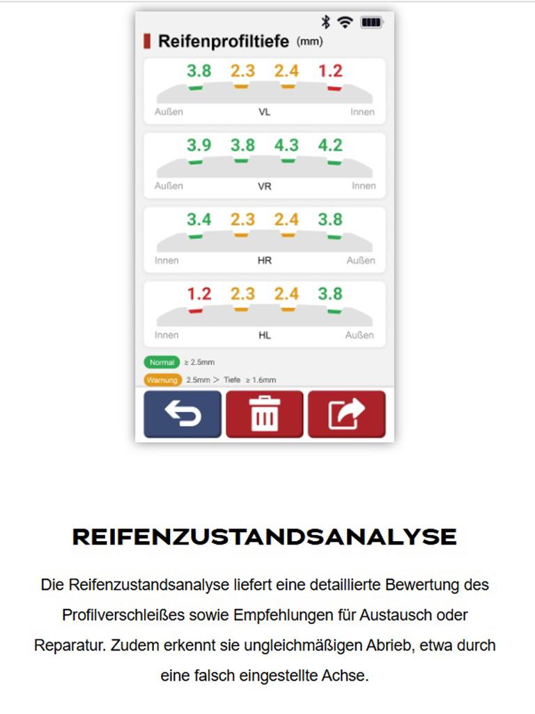 Unser Reifenprofiltiefenmesser erfasst präzise den Verschleiß des Reifenprofils und liefert detaillierte Analysen zum aktuellen Zustand. Basierend auf diesen Daten gibt er gezielte Empfehlungen für Austausch oder Reparatur. Neben allgemeinem Verschleiß erkennt das System auch spezifische Abnutzungsmuster, die auf Probleme wie eine falsch eingestellte Achse oder mechanische Mängel hinweisen. Durch die frühzeitige Identifikation solcher Ursachen können teure Reparaturen vermieden und die Sicherheit sowie Lebensdauer der Reifen optimiert werden.