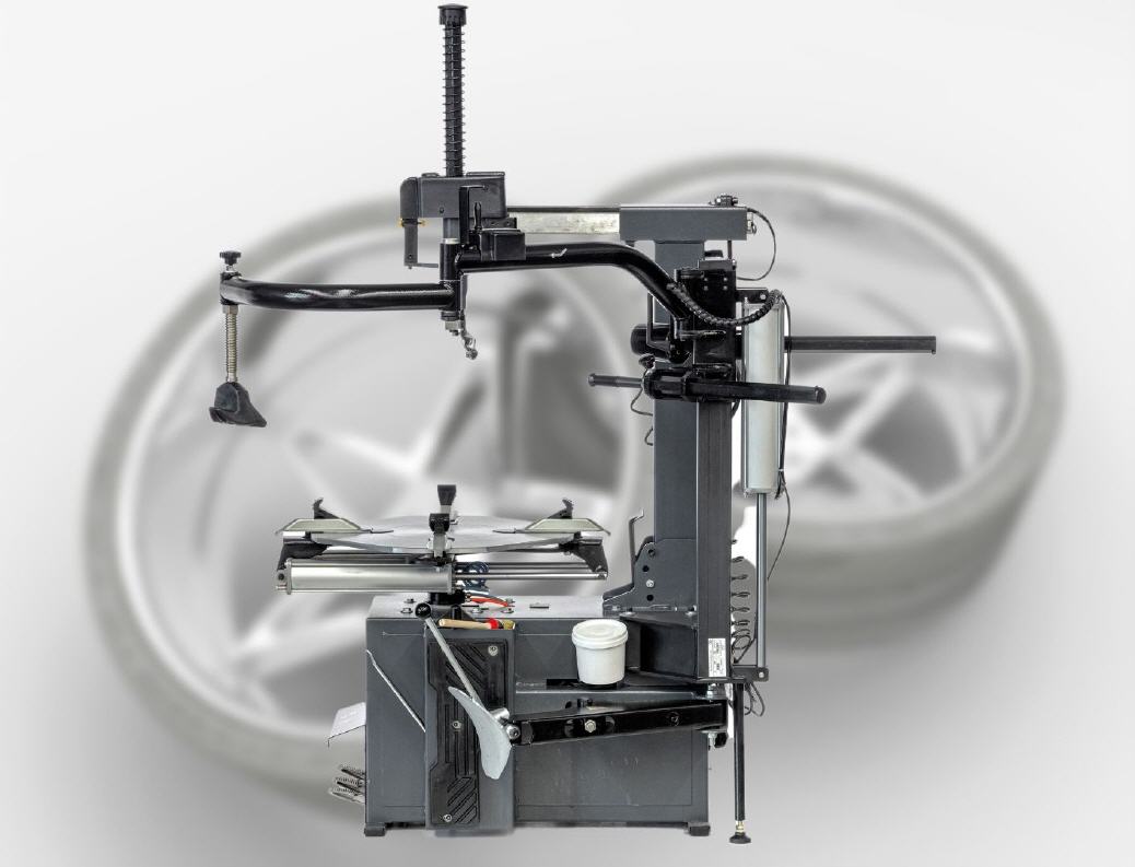 Reifenmontiermaschine mit pneumatichen Heckschwenker, bestens geeignet für PKW-Räder, mit optionalem Zubehör auch für Motorrad-Räder