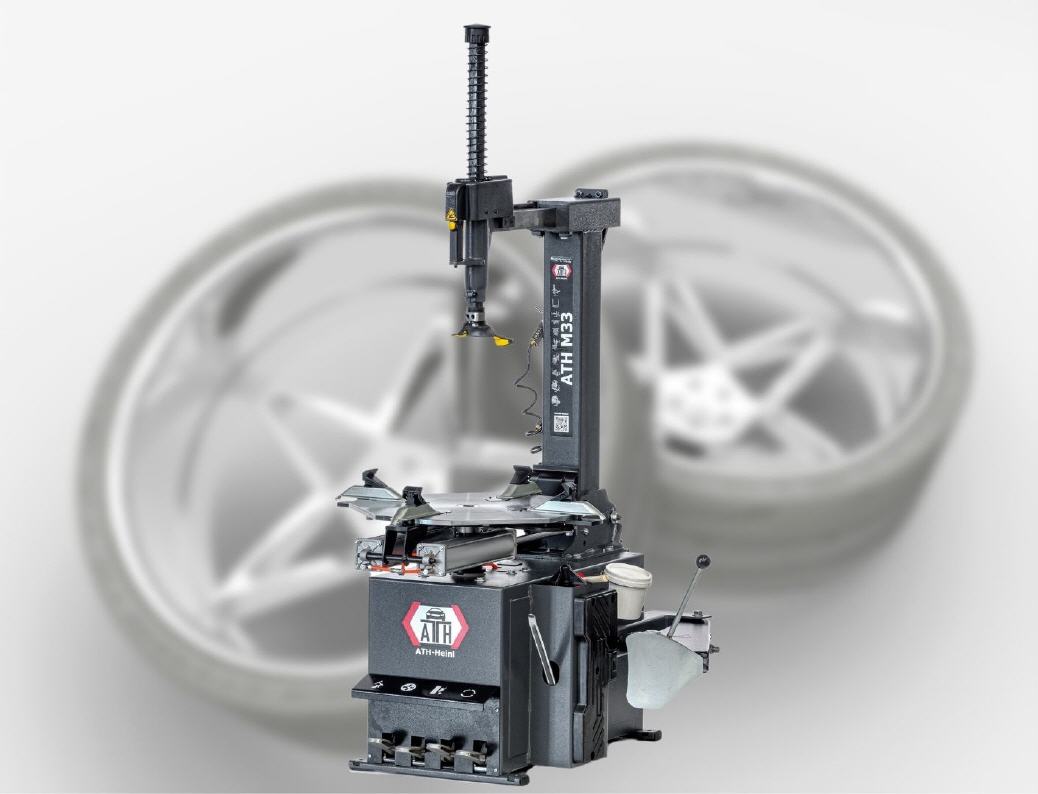 Reifenmontiermaschine mit pneumatichen Heckschwenker, bestens geeignet für PKW-Räder, mit optionalem Zubehör auch für Motorrad-Räder